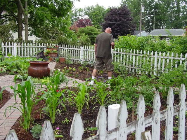 | No black boxes where the pictures should be, Michelle, but just a very black monitor. Apparently my computer has decided that something internal is not up to snuff and it's at our computer guru friend's house or a thorough evaluation. I was unable to get any sort of life on the monitor, nor was I able to get it to shut down. Bad thing is I can't get to my e-mail since I've long since forgotten the password for the account. ;/ I agree the progression of your garden is just lovely, Michelle! and your husband is a good egg to help out a neighbor like that. Never know when the favor may be repaid in kind. Generosity of deed and spirit are fine attributes that make everyone's lives easier. Denise, I love the stencilled fence. Beautiful! I particularly like the color combination. How are you doing it, with a stencil brush or spray paint? Time is limited on the helpmeet's computer so I've not explored any of the links to the Larsens. the camera sure takes a nice shot, and you have a great eye. The back deck of your home is just super, Saucy. What room were you in to take that shot? I laughed at the stickers on the windows... funny how those little things get overlooked, huh? But do remove them, they can leave discoloration on the glass. Fabulous news about the reorganization, V.! Are they going to put you in charge of it? I can only image how much that must brighten your outlook. Wish I could say as much for my own position. ;) The more things stay the same, the more they remain the same... But not here. The workbench is completed. The garden tool rack and the sheetrock storage have been flipflopped in the bahn. A pegboard storage rack has been sited (per my instructions) next to the bench. The window hardware is now in place, nearly 2 1/2 yrs. after the windows were installed (wouldn't "go do anything half cocked now", would we?). A large lidded, galvinized barrel has been put into service to receive the ashes we clean out of the stoves weekly (has to be metal and sited on a non-flammable surface since ashes can remain hot for some time). There were some attempts at "suggestions" during the work this morning, but they were largely over-ridden and in the final analysis there was an appreciative and admiring nod to the time I'd put into the reorganization and how smoothly it all went (-3hrs.). JulieJobs rule! Left to solve (my contributions to the EAT program): Also beginning the process of a website, which several friends insist is a necessity. Thoughts on this? I am humbled by how very little I know about any of this stuff. But necessity being the mother of invention, it will be surmounted. :) And it needn't be hurried, which puts a nice spin the creative aspect such a project offers.