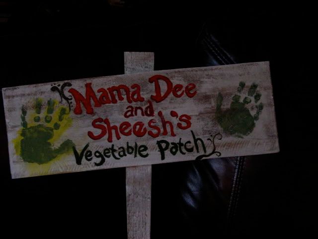 | Hi Everyone. Someone asked me to post a couple of pictures of the potager and the dogs. I hope there aren't too many repeats here. This sign was a Christmas present from Mary, Brandon, and Charlie. Charlie's little handprints on there. He comes over every day in the summer and eats from the veggies. Mary and Brandon said he thinks every veg comes from our garden. He made up Skip's grandpa name, just started calling him Sheesh.