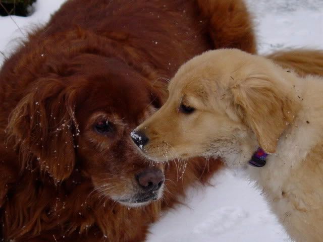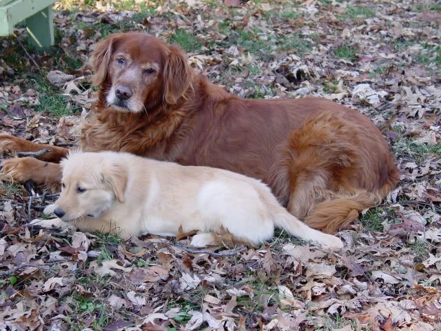 | First week we had Ginger. Maggie has turned into such a good mom. She puts up with this puppy's antics with great patience. I think she likes the company.
