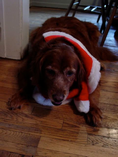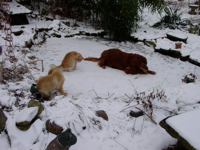 | Drema, I don't think we can ever have too many pics of pets, kids (grown or otherwise) or gardens! So glad the new baby is settling in so well and the "old folks" are so comfortable with having her around. Love that picture of the three of them on the watering hole-Ginger made me laugh with her butt in the pot. She doesn't look so sure about her finery, though-teehee. Your boys both look like fun to have around-good looking family, too!