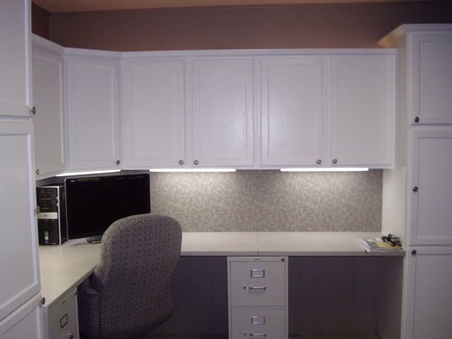 | I’m glad to see that its spring some where. Although, we’ve been having warm temps and a lot of our snow has melted. Kathy, I really love seeing the shots of the vineyards. Although, there are a few around here you really have to look for them. We wrapped up most of the home office project this weekend. I’m about done in, but will continue with painting at the parent’s house. Then I hope to leave the painting supplies lie dormant for a while. I really need to do some Julie jobs before spring hits here. Thanks for the kind comments on the laundry. It’s just 1000% nicer than it was. There must have been a problem at the pool and it was closed for nearly the last 2 weeks, so my excersice routine needs to get going again. Chelone, what were you doing in my basement taking pictures? If the floor were a little more smooth in the garden shed, I’d love to have a painted floor design. Maybe I could put one in the playhouse. Denise, you sound like me after seeing the live moss, camellia and such in Florida. The spanish moss was just so foreign looking to me. Marian, great to have you back! I’m sure you have a few stories to tell. PM, great to have you back as well. Sorry to hear that you aren’t feeling well either. Mary, I sure hope David is released, as Dorothy would say "there’s no place like home" Here is the nearly complete office, the paint color above the desk doesn’t really show up the correct color on screen. It's a greyish taupe. We started with unfinished cabinets, painted them and added the crown molding. It was challenging in many ways since in this old house the walls weren’t straight and the floor wasn’t either. Luckily DH and his son did the hanging of the cabinets. The fabric between the cabinets and desk is covering a tack board. We made our own for about $15. To buy them for that area would have been over $200 from an office supply place. Chelone, the fabric is upholstery fabric that we found on the clearance table for 50 cents a yard. I don’t believe I’ve ever gotten fabric that cheap. All the cabinets are for DH's clutter, I'm hoping it will work ;o) Michelle |