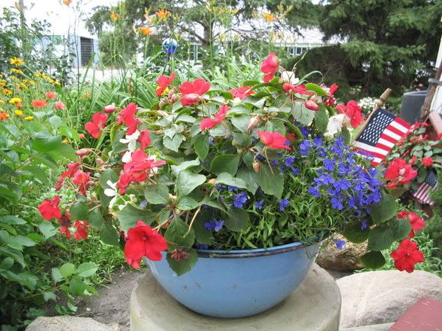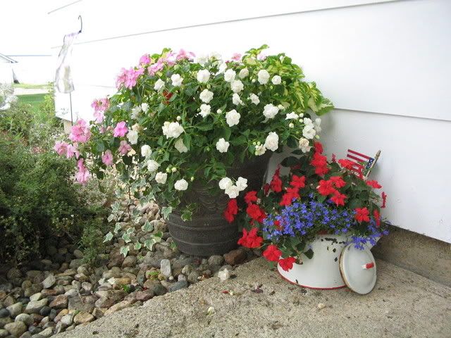 | Michelle your patriotic themes are wonderful. I especially love that one with the white and red enamel pot? That is *so* pretty! Love the color combos in your latest submissions Norma...Love that bronzy look and do you notice that the color of the coleus matches the copper bands of the whiskey barrel? :-) I love going barefoot too and have been doing it ever since I was a kid. Of course now I have feet of leather...LOL! Seriously though, there is nothing like the feel of soft grass on barefeet...one of the best "simple pleasures" in life. Well I found some pics from years ago, but haven't done anything in recent years. These are all from different years, but apparently when I get an idea I like...I like to stick with it...LOL!