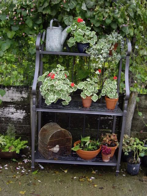| Deanne, loved your halloween vignette. You find the neatest containers and I love finials in any form and material. Michelle. I am amazed that your copper boiler has lasted that long. Who knew, copper would be so long lasting in the garden? Norma...enjoyed both your whiskey barrel pics and the pic of you waterinjg it. I have two whiskey barrels, but I have been growing peas up a trellis in them. String beans in the summer. I keep trying to plant something pretty around the edge, but nothing has looked good yet. Ei...great watercan collection! My fav is the purple. Also found the birdbath with succulents so eye catching with the alliums which are huge! I am a big fan of wire racks and mossed containers. I have one hay rack to fill this spring and I am going to need help figuring out how to moss it. Denise...I love your trio of wire baskets with succulents. Are they heavy? What did you use to hang them? I also love your bird cage idea with the candles in it. Marian...Your Achimines is so unusual. It reminds me of a streptocarpus, one of my favorites. Eden, the dish drainer is amazing! lol I would have never thought to put the dishes in it..and it fits just perfect! I have often wanted to catch a few yard sales to find some unusual containers to try to repurpose like this, but I seem to garden away most weekends in prime yard sale season. I did buy a couple of wire wastebaskets with the intention of mossing and filling, but I never did get around to it. There's always this year...hope springs eternal. Okay, who pray tell, is Angela? [g] pm2 |