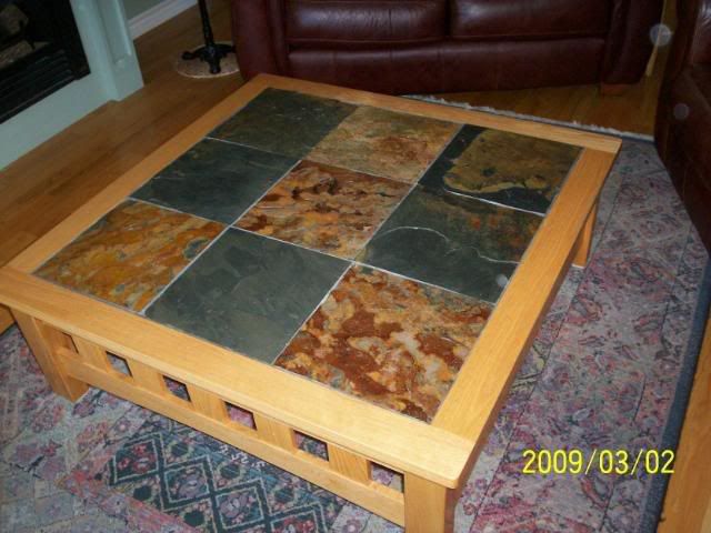 | O.K. OI'll start. This is the coffee table in our living room. It was hand made for us by a friend, using red oak to match our floor and mantle. The slate tiles are left-overs from the kitchen floor we installed on our old house and DH and DS inserted them themselves. Adrian loves it because there are fossilized plants in the slate. I love it because it wears like iron, much needed in my house!