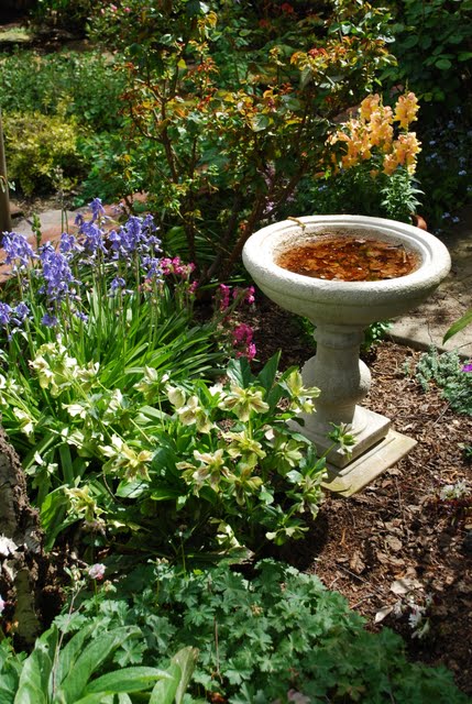 | I’m wrapped up in fleece tonight- the sun is out but it is not warm, and I fully expect frost on the rooftops in the morning. Mr postman delivered a box from Rosy Dawn this evening, and the new babies are unpacked , watered and sitting in the kitchen. Very excited I got Lancelot Mocha Velvet , which I have drooled over at Deannes . Cyn, I bought yet another birdbath this spring, which I don’t think I’ve shared a pic of as yet. Employee discounts are a fine thing. Happy that you find anything I have going on here inspirational ! I sure try to do what I can with a very small lot . Yes indeed Norma, the rain has been a frequent visitor this year. I always worry about the first bloom flush on my roses, most of which are not even cracking and showing color yet. We have been in drought conditions for the last couple of years so this rain is really a good thing; it fills the reservoirs and contributes to the snow-pack in the Sierra which in turn supplies water to Northern Californians. That Wyatt is a very handsome young man !(for a kid, lol) Fabu pics posted today ! I learned in my photo class about re-sizing or even opening and closing pics and how it can degrade the quality . I hope to learn more about this in my class I’m taking in May; I have noticed the same thing. Michelle, The Hellebore is called Painted Lady. Really happy with it, it is quite ‘upward facing’ as Hellebores go, and has been blooming for a very long time. Here is a close up pic that I took a couple of weeks ago.