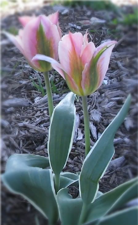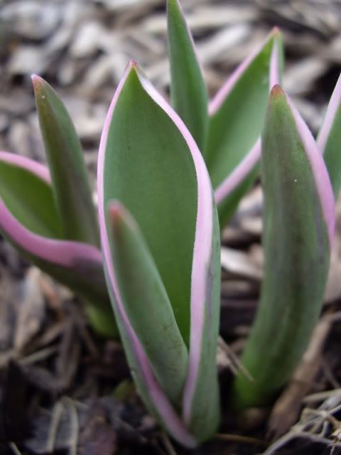 | Of course my issue of FG isn't here yet, you know it takes longer to get to the midwest ;o) For the inquiring minds, last fall I was trying to hose the soil off all the many cannas that I wanted to keep and didn't want the soil in the grass so I got to thinking that the rectangluar compost sifter that Rick had made me would work good propped up on 2 pails and all the loose soil would wash back into the garden and the cannas were wonderfully clean. Cindy, the gift was about the best you could get - $35.00 cash. Actually, I have a container that Backyard Living is considering for publication. I haven't seen what FG container contest is this year, but it usually involves "rules" as to what plants to use. Somehow I can never get that together. Eden, what are you painting now? LOL on the dream. I had one the other night that our newest DIL won one of those fabulous coleus standards and I was very worried about the fate of it. Crummy weather here. It rained like crazy last evening. 40 degrees and windy today, but Jaden and I still took our walk. We sat by the pond for a bit after Jaden chased all the ducks away. We are a stopping over spot for many ducks and geese on their way further north. I checked the gardens and am please that things seem to be showing up daily. I usually only worry about the plants that were new the last season. I figure if they make one winter, they probably are here to stay. No sign of the Gentiana scabra. Anyone know if it is a later riser? I'm hoping it is since it is a fall bloomer. I love the emerging foliage on these tulips: