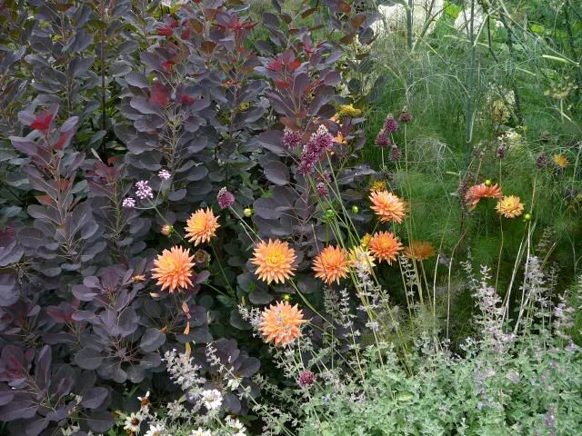 | It was glorious today -- temps hit 60s - and for once on a day off, I was able to take advantage of it - drs in the a.m. and then out into the garden for rose pruning and some more cleanup... altho after the other hours on Sunday in the garden, I confess the body was aching and not so willing as the spirit today, LOL. Chloe was having a ball -- back in her element, her yard has been reclaimed and she was on patrol. Sadly, there's to be rain later in the week, so I suspect my chores will be postponed. There are several climbing roses that need some serious hatcheting... I think I managed to prune most of the clems back tho. Cynthia - I enjoyed your Flower Show photos and regret not having gone this year, altho I doubt I would have found a good time to go, from awfice stuff....but it really gets you pumped to garden doesnt it? Well, to contribute to the organe theme, not wanting to fall down on the job, I borrow this photo from White Flower Farms visit at IU last year -- I thought this so striking....