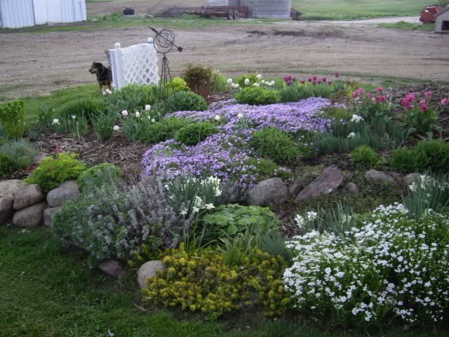 | Horribly windy again. Kenzie is spending the weekend and would like to spend all day outdoors. We hoed in the veggie garden, took a tractor ride and helped grandpa pick up rocks. Kenzie walked into her garden and said "my garden is a mess! Look at all the weeds" She didn't really want to help me weed though LOL Its a good thing I have lots of tulips in my gardens as we have had at least 4 flower picking trips around the garden. I had bemoaned my spring garden earlier, but for some reason this year it really has a lot going on. I'm quite pleased with the epimediums that I put in last year. The candytuft looks fantastic, better than in years. Brunnera 'Jack Frost' which has been kind of a dud for me is actually blooming. Of course all the tulips help also. Which reminds me, last weekend we stopped by my sister's neighbor who had an absolutely huge bulb display. He is really into bulbs and digs them up each year, composts them and plants all new. Expensive and labor intensive in my book. He was out when we stopped with a measuring stick and a notebook which I got a kick out of. I have nothing in my pot ghetto which is just amazing. I'm a little disturbed by the deer footprints right by the house, a munched hosta and a few other things that have been nibbled. The Liquid Fence has been hauled out and I will have to take care of that task asap. In the past I've never had much problem. Last year they ate my Bright Lights Chard to the ground every time it would send out new leaves, but left pretty much everything else alone. I posted a few days ago but I don't see it now. I wonder if I only previewed and never posted. 'bug, 'Autumn Delight' is probably 12-15" tall for me. Speaking of poppies, of the perennial kinds I have some reds that of course do fabulously. All the others have failed. I do see the "Princess Victoria Louise" poppies that I grew from seed last summer look like they may produce this year and "Ruffled Patty" which I bought last year survived but is very small. I have lots and lots of annual poppies that seed everywhere. They all live around my garden shed except for "Lauren's Grape" which is in the butterfly garden. A couple of shots from the raised stone garden that is right outside the windows in the dining area. Spring is this gardens best time by design. I figure when the weather is cool and rainy I can still enjoy this area from indoors.