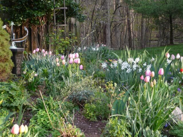 | Good morning....gee, it was a busy couple of days here. Such a burst of posting and photos! Kathy...LOVE that photo of your yard and that Lady Banks rose is amazing! Nice pruning job. It really does cover itself with blooms. You are inspiring me to keep trying with the roses. I have all five of our small roses pruned and composted cow manure added in the fall. Do you fertilize in the spring? Would you call that an obelisk, that is painted blue? Is it home to a clematis? The blue is just enough and very cheerful with the Lady Banks yellow. All that SALATing has paid off. :-) Gardenbug, great photos of your vegetable garden. Makes a nice view from your house? What makes me think roses will be going up on the arbors? [g] What are your plans for this year? Does DH enjoy the gardens? Gee you could probably grow your own food for the year in that size garden. Will you be canning at all? Sounds like your knee is improving. Denise...is the gate project a team effort? Marty has some serious skills. I love that window and the roofline of the house behind it is attractive. Pretty borrowed landscape. When that fringe tree blooms, it goes to town..lol. Can't wait to see the finished results. Martie....You and BGF must make a good team. Must be a great feeling to be on track for the growing season. Especially after a few years of no garden behind you. Seedlings are looking good! No pansies open here yet. Mary, I envy you your organized garage for sure. I am sure DH will come to appreciate it the next time he is looking for something. Woody, sorry you are still having computer problems. I used to lose posts until I started using Wordpad and now TextEditor on the Mac, to respond to threads. I keep two windows open and then copy/paste it into the site. Works every time! Honey, sorry to hear that Michigan is being so hard hit economically. Wishing there were some better news on the economy front. How is that cutie, Missy? We watch The Dog Whisperer at our house too. Great show. Cindy, what a pretty spring bed! I like that you have so many bulbs together to really make an impact instead of scattered a little here, a little there. Good job! DD just started a new job and I will be dropping her off at the train station in the mornings. I'm looking forward to such a nice way to start my day and there is a Lowe's to stop at on the way home to see what is in the nursery once in awhile. It was freezing yesterday morning. Saw two gorgeous variegated, cream color hollies in standard form. One had red berries on it. $29. a piece. Almost came home with them until I noticed they were English Holly only hardy to zone 6. Thought I'd save myself the disappointment. Not really feeling well enough yet to get much done in the garden, although I keep trying. Half hour out there yesterday morning that was it. Trying not to get in a twist about it and plan to spend the next couple of days babying myself to see if I can feel better in time for gorgeous weather next week at least. Since I am not getting about taking photos...here is another from NG....