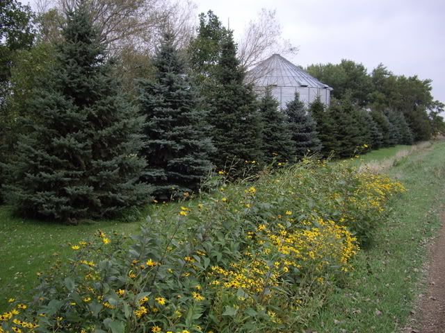 | I’ll be leaving on Friday a.m. to go to my niece’s graduation. They live near Lincoln NE. So I don’t feel so bad that the weather is crappy and the garden is soggy, but it had better shape up after that :o) Since the weather has been rainy I’ve been trying to wrap up indoor stuff. I am still putting seeds in milk cartons as we empty them. I called Kenzie last night to see how she was doing. She had another sinus infection. She was quite excited that her daddy had dug up a little plot for a small vegetable garden. She told me that she wanted to grow tomatoes, pepperoni and blueberry pie in "her garden". Mary, I’m sure you are relieved for now. Hopefully, something will come along for your DH that would allow less travel but no move. Chelone, we have blue spruces along the road for screening. They are probably 4-5’ below the grade of the road. They seem to do well. The downside is they amount of time they take to get to a decent size. In this picture they are probably 15 years old. This was a planting done before I came on the scene. PM2, I have the ‘Darts Gold’ as well and it really looks pretty in the spring with the irises. What a pretty picture of the pond and swan family. Who has worked with hypertufa? I was totally inspired by the nice ones that I saw at the nursery. I bought some of the plants they had used in them. My sambucus was planted in 2006. It does have some buds on it this year. The shape is a little weird thanks to the rabbits. I hope the sun shines where you garden. Michelle Spruces along the road: