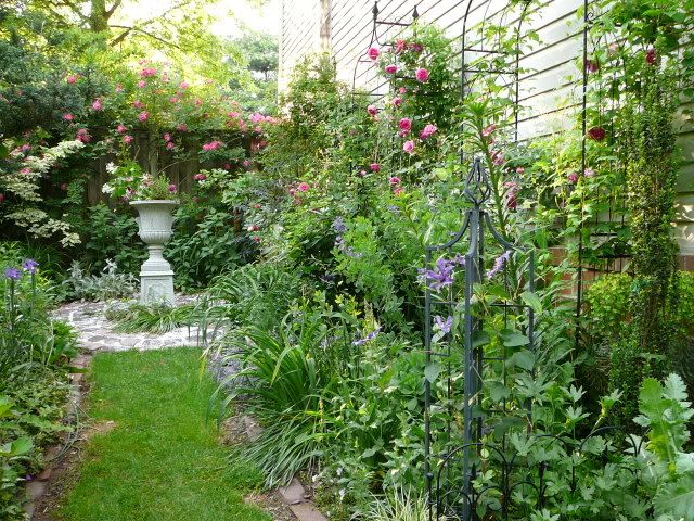 And a longer shot of the inner backyard with the Juuli Clem, baptisia, roses and dutch iris: