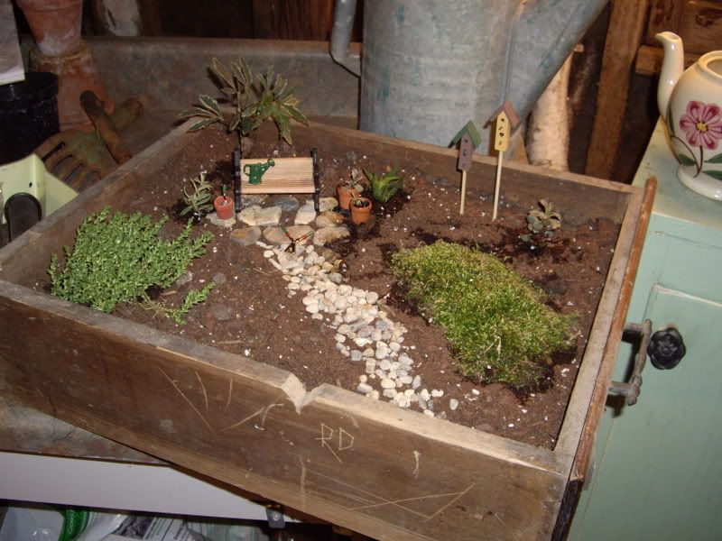 | So far this is all I've accomplished in the container dept. Tomorrow I think I will get all the plants outside. Right now some are in the house and some in the garden shed. The forecast looks pretty decent with the nights staying around 50 or above. Tonight was spent mowing and trimming and then it was dark. This is my first attempt at a Wee Garden. I did pick up a couple of plants with miniature features that I need to add. I think its one of those things you can keep adding to. This is an old drawer that came from a bar that was being torn down nearly 20 years ago. I wonder who RD was.