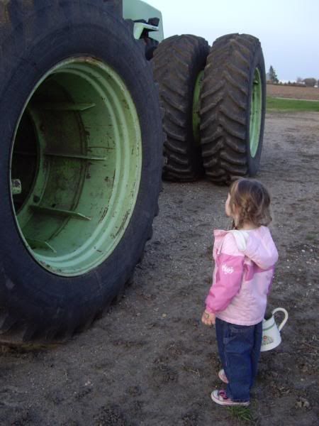 | Kenzie is one lucky girl to be experiencing life in such a pure form. Love the photos. You could see the awe in her eyes. For some reasons, huge tires, like on the tractor, have always scared me. LOL. My grandmother had a working farm, and I always stayed clear of the tractors. |