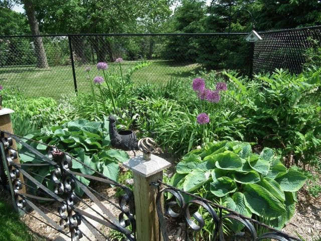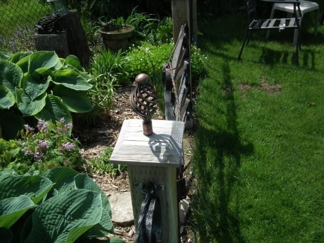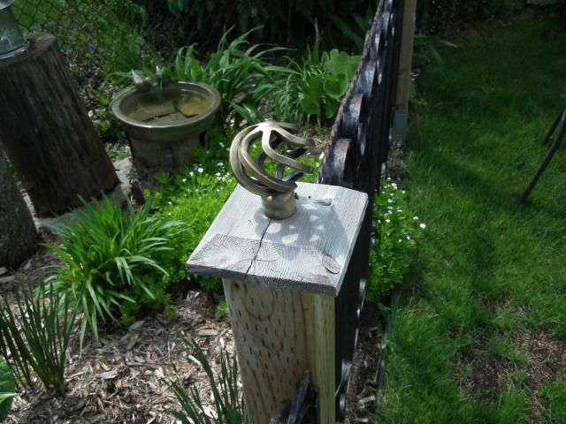 | I want to show you my Spring garden in the back yard with the finials on the posts. They are curtain rod ends bought at a garage sale for $1:00!