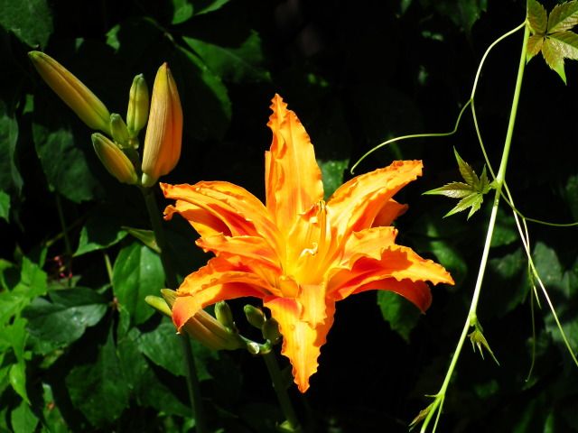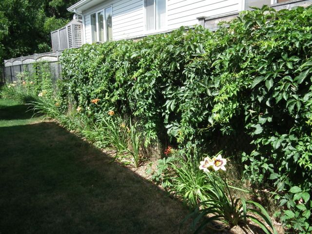 | Hi friends! I am trying to learn a little more about my camera and posting photos. Today I managed to replace the batteries, take some new photos, transfer them to the computer, move them to Photobucket, and post one on facebook. Believe me, this is a personal best for me! Cyn, the Spite Fence planting is going very well! The Virginia Creeper is fabulous and the daylilies really add to the look. The daylilies were not as good this year as last due to the dry conditions, but even so, I am very pleased with the results. I am adding Clematis to the far end; that is the part we usually see from the yard and deck. I am not sure my neighbour would be pleased that this has made me happy *LOL*