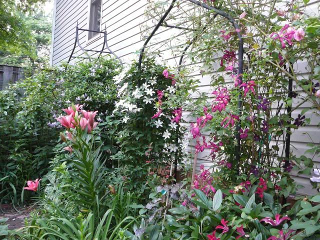 | So hard to check in - even in the evenings -- that knee high grass got its haircut last evening so it's not so dreadful looking in that garden anymore (altho more rain expected tonite, sheesh) -- thanks for kind words - I just try to look past all the undone work (& hope you and lurkers will too) and enjoy the color while it's there - and trying not to be in that panic mode we all are feeling -- too too much to do -- but what I was hoping to share -- the clematis do seem to be happy this year, even if the other things have issues - and I do love the color while they're happy. Even more have shot open -- Abundance, The Pres, Rooguchi, Etoile Violette, Prince Charles, Polish Spirit, Venosa Violacea and I think I might have the first blooms this year from Laura and a few others getting ready. Kathy, it's hard to believe my area is ahead of yours - but I was astonished to see those lilies bursting forth - early for them this year -- I do think they are Manhattan after ogling them in your gardens for years, Deanne -- purchased a few years ago when you were kind enough to share their name -- I've also got some asiatic Ceres (double reds) that were only double one year and come back now, almost the same color - but always singles - go figure - so sometimes Im not sure which bunch is which... Saucy - I love the GG and that grouping is lovely w/ the geranium phaeum samobar, etc. (one of my fav geraniums)... 'bug - you are so right about Deanne's containers and eye for combos -- I too would not have thought I ever would enjoy caladiums or "exotic" foliage - but Deanne puts them together so amazingly, they are stunning and then I start to think, gee, maybe I'd would like to have one of those, LOL..... How nice to know I can call myself an IGG for Kathy's place too - cant wait - need to buy a suitcase tho and some other "supplies".... we're into a daily countdown! I love a lot of oldfashioned flowers - like those cup and saucers -- there's a good reason why folks have grown them for so long!! We've hit 90 degrees here today I believe w/ strong t-storms on the horizon - I do hope tho for a garden weekend PLEASEE! -cindy |