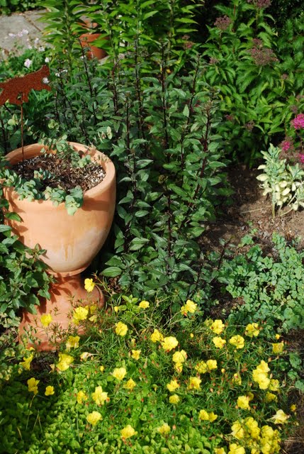 | I have to say we are having the most peculiar weather this spring..I awoke to frost on the roofs again this morning –the temps warmed up fast as it was sunny and no wind, but they are dropping rapidly this afternoon, with wind and periodic little rain droplets. On the plus side, one can plant without fear of the new little fledglings enduring heat stroke. I put the turtlenecks away, only to drag them out again. I took a chance and planted the basil forest this afternoon, the Dahlias have lived through the frosty morning just fine and so the basil should prevail. I am casting a thumbs up vote for the potential color scheme at chez Denise..My hell strip has undergone numerous transformations through the years-when we moved here it was full of really sad looking Fragaria . I don’t even remember what was there before the current stuff. Seeking more garden space, I made it part of the front garden. The soil still needs more work-it was dreadful and pure hell to dig. The most recent rain episode seems to have passed over, so I will WALAT –making a nursery list for tomorrow. How can I possibly need more plants ? Kathy in Napa