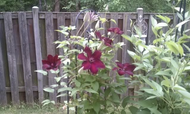 | I'm out here Woody. Just been to busy or to tired to get on the computer much. My mantra of no new garden beds this year has gave way to a small but hard to dig one in the area I can't grow grass and the bank area of the barn that is visible from the house. not to mention the upkeep on all the rest of them. Extreme heat doesn't make any of it easy, so none of it will be at it's best this year. I'm enjoying it all anyway. The clematis despite the not so great foilage have bloomed much better this year with all the rain we had. Things are drying out quickly now though. I need to get the iris stalks cut down. the daylily scapes are coming on strong now. A few early ones are starting to bloom. Niki doesn't much like this heat. Like Chelone I think of you all pretty much every day. The weather this year is pretty extreme but I guess we all have to make the best of it. Waving~~~~ Norma. |