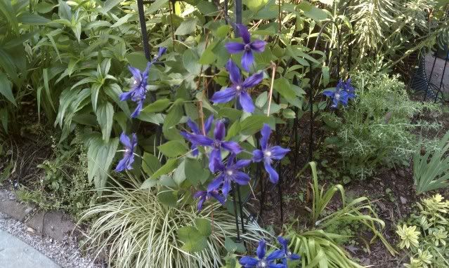 | Managed to get some things done today between moving the hose around. Of all that rain we had things are to dry now. Our sandy clay drys fast on top. did some weeding in the areas that were wet from the sprinkler. Lots more of that to do. Need to thin a bunch of petunias and vinca that have reseeded. Impatients too. Wanted to go back out this evening, but tuckered out after eating. Been awake since shortly after 3 am when the earthquake woke us up. It lasted less than a minute but was a bit unnerving. Just a loud noise and vibration of the whole house. Bug do you ever grow a companion clem with Roogucchi? Have any ideas of what would work? Anybody? Woody how is the clematis swag coming along? Kathy I am always surprised that though my garden starts earlier than those north and east of me , theirs catch up so fast. Yawning here :0 so off to bed. Norma |
