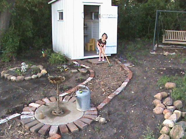 | Lol, I love how Kenzie seems to get progressively more 'disheveled' in every shot! Shes pretty cute for a little kid I must say :-) I love the design of the paths and the rock borders, and can't wait to see the finished product. How nice it would be if every child had a secret garden. Kathy in Napa |