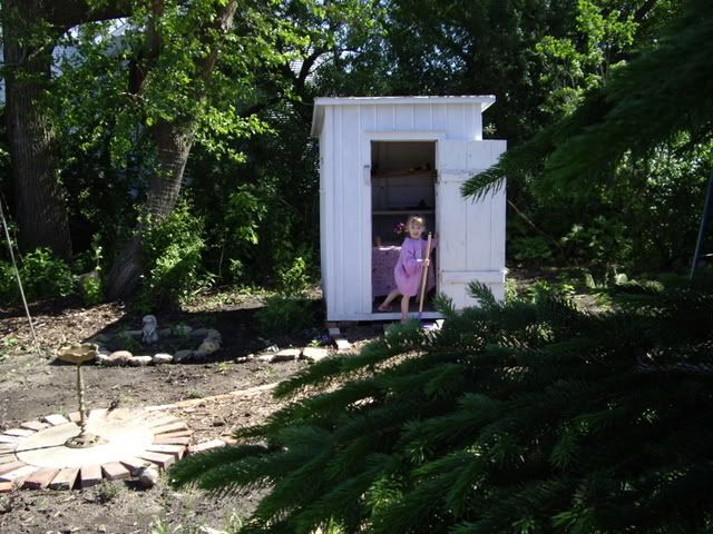 | I love the little path leading up to the playhouse! What a magical play place for a little girl! I agree, that's a pretty teapot! I think I like that she's fresh from the field for the annual bench shot :) She'll appreciate it too, someday, when she ponders where she got her love of gardening :) Thanks for sharing with us! Saucy |