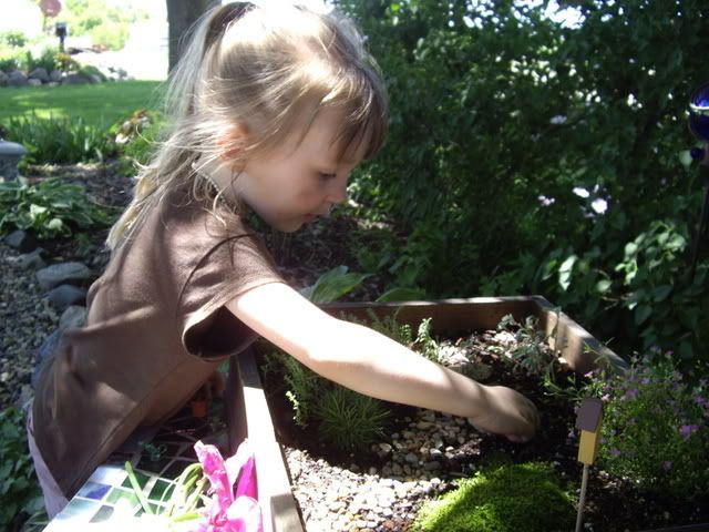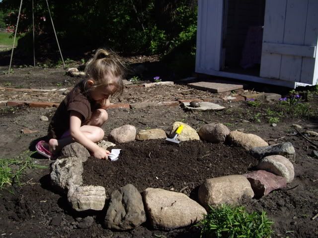 | YESSSSSSSS! I see the photos tonight! Oh how perfect for a small child! I agree with Marian, the flower arranging is a super sweet shot, also the Wee Garden. I hope she can come to this garden every summer until she is 50, and beyond! How dear of Rick to help you with this project. |