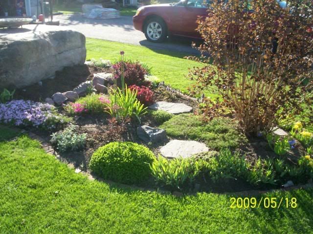 | *LOL* The concrete scupture is supposed to be children, fashioned by the artist on my own two when they were little! Picking at toenails, well, yeah, probably *LOL again! We did not have a green tea toast for the mailbox: DH saw the specialist today, she, too, is happy with his condition, and we had a glass of wine toast, for the first time in a while. It is still too cold and miserable here to sit out by the mailbox for a sit-down. DH's sister from Calgary called yesterday and they were having snow flurries. No idea about the Iris, they were here by the garage when I got here. The furry plants you see, Kathy, are Pulsatilla seed heads. Want some? The boulder garden always looks nice and tidy but I am finding it boring. I have planted some Cannas and some Pelargoniums out there now but the weather is too yucky to encourage them to do anything. I'll give it a few weeks. Geez Chelone, OF COURSE we only take photos of the good stuff. The normal stuff - raggy, weedy, overgrown, sometimes pretty, we kinda leave for the general populace. I will try to take a photo of the awful (not awesome) rock garden for you tomorrow. It is very, um, realistic. or rustic. May not actually get to it tomorrow come to think of it. Have to drive two hours to another town to look at a fence we are thinking of buying. You know the saying "Good fences make good neighbours"? Well, I think it will take more than a fence, but ya gotta start somewhere. Gotta run and tuck in the boy. Cheers,all! Julie |