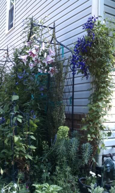 | OK gb - I'm stumped :-) That's undoubtedly something I should recognize but am not in that close-up view.... This clematis at the end of the garage is looking great today. It's growing on that copper and wooden tripod I made spring 2010. The clematis is not all the way to the top yet but I think the top is too shaded under the roof overhang for it to want to grow there. I think the clematis is Nike but I wouldn't swear to it :-) I just trimmed it up a bit this spring, not hard pruned it, but it seems very happy. |