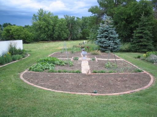 | A 19 month old sure wears me out. Eden, how do you do it? Kenzie gets in to EVERYTHING! And she is so quick. When it started to thunder and rain slightly DH suggested going to town for supper. We ate fast food, went to the park by the lake because it had clear off and was a beautiful evening. Kenzie has no fear of the slides or climbing. Then we went to Walmart for a few things. She did fall asleep within 4 min. of laying down, so I guess we wore her out. I finally finished the veggie garden: The nearest arch is annual flowers from seed. The far arch is the asparagus bed. The front 2 quadrants are veggies with pole beans on the tripods. The back left is a cutting area with flowers from seed. The back right is empty except for some left blue fescue grass that I didn't move out yet. I plan on using this area as a holding bed/perennial propagation area. Its not huge, but just the right size for us. Its almost 11:30 so I shall just say goodnight.