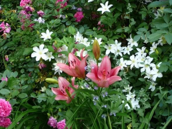 | Cindy, we must have been posting at the same time, I love that lily/clematis/rose combo!!!! Gorgeous. That lily looks like one I have here called 'Manhattan'. We are going to be in on that heat wave too. I guess we'll have to break down and turn on the AC. Deanne |