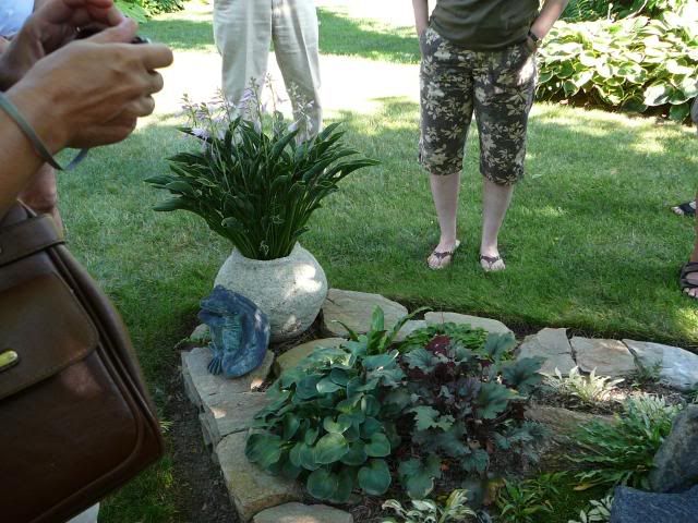 | Good hot morning... yes, I know the temps are lower, but I have continued to have commuting nitemares daily and it was another one today (at least there was a.c. - last nite's trip home had none and I seriously thought I was going to have heat stroke)....it makes me rethink what my work options are on a daily basis - guess I should buy a lottery ticket. Deanne - thanks for the rant -- you and I seem to be on the same wave length -- my garden is toasted and I barely have any energy to walk the dog let alone go out later to see what's died or near death... I was just thinking last nite it's only the 10th of June and I've lost my enthusiasm for gardening right now - it's likely to be a very long, sad looking summer. Again, when we started talking about hostas, I too thought of the marvelous garden we saw w/ the creative rooms and the front one where the entire mini hostas resided... I had in fact purchased Blue Mouse Ears in the spring of 07 and do love it .... here's a pic of the minis we saw so cleverly displayed -- it was such a great small bed w/ a lot going on from different angles; this one reflects the cool 'tufa pot w/ the hosta growing out of it that we all wondered "how'd she do that?" Cynthia -- love those parties you throw!!