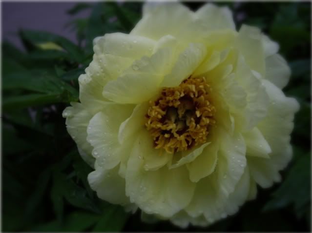 | Lavendar, roses, rosemary, basil and oriental lilies. I picked up a rosemary on clearance at the grocery store tonight that I plan on trying as a topiary. I had lots of fun cutting off the lower leaves and smelling away in the potting shed with the rain outdoors. As I sit here I was reading some of the book that I got from Backyard Living, one of the stories is on conifers and Rich's Foxwillow Pines in particular. This was a 2006 IU stop. Between rain drops I found this in the garden this evening, my still young tree peony.
