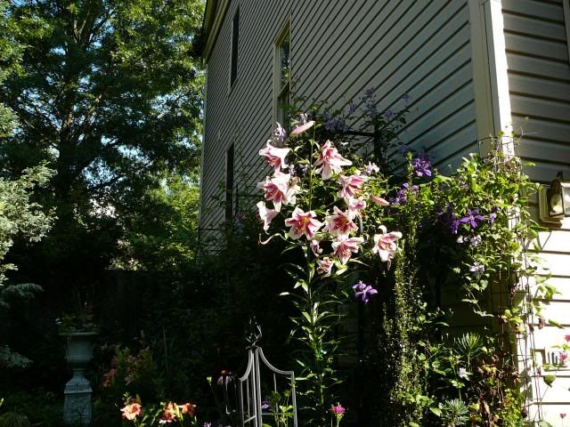 | We got nearly 3" of rain yesterday afternoon. When it started to rain we decided to go out to dinner in the city. I spent the day and part of this evening mulching Kenzie’s garden. It is extremely humid here so the sweat glands get a good work out. Who needs a sauna? The gutter on my garden shed that feeds my rain tank broke under the snow load last winter. We got it fixed just before the rain. I received the chandelier for the garden shed today. I spent some time cleaning it and assessing how many crystals are missing. Actually only one but several others are missing the top round crystal. Interesting that so many of you liked my patio garden. It was my first and I struggled with it for a long time. I wanted a flower garden and finally came to terms with a shade garden and the flowers went elsewhere. I left it go for quite a few years while I started other gardens and now have started to revamp it. It’s hard to tell but I’ve added some cool plants and have plans to add more. From above it’s hard to see tiarellas, epimediums, tricyrtis and hellebores. That is the potager just to the left of the long border and then to the left of the potager is the garden shed. My daylilies are just starting and I have just a nice number so that the deadheading is not overbearing. Kathy, I was wondering if you got any germination from the celosia I sent you? As for the clematis ‘Pink Fantasy’ if you look back at the last Idyll fairly close to the beginning I posted a picture of mine. The color is true to what it is for me. It was just planted last year and I was very pleased with how fast it grew. Just how old is Mr. Toddler by now? I was thinking I had ‘Silk Road’ until I saw the height on Cindy’s. I checked my records and see that mine is orientpet lilium 'Triumphator', which is similar but not as tall. That is amazing Cindy. Deanne, thanks for the additional Garden Conservancy pictures. I enjoyed them a lot. How awful about your neighbors and all their annoyances. I know the challenges of gardening with less than perfect views, believe me! Marian, sorry to hear that you are having such a tough time. I’m glad Tim is able to help out. I’m quite busy with Liquid Fence this year also. It is awful smelling isn’t it? Woody, I have to admit that we were both on the roof. We get on the one story part of the house first and the go up to the second story from there. We do not have a very steep pitch at all. Denise, thanks for the offer of cuttings but I’ll survive without it. The nursery where I got it last year might have a few lurking around yet. It is quite amazing isn’t it the things they have done with fireworks. I was the most amazed with the smiley face ones. Saucy, you are right FB is fun little chit chat, but here you do find out alot more. I went to my parents for lunch today since Rick was there helping them with their patio. They are adding an edging of pavers to make it larger. My mom was so excited to have a 9" bloom on a pink oriental lily. I guess you are never too old to get into gardening. |