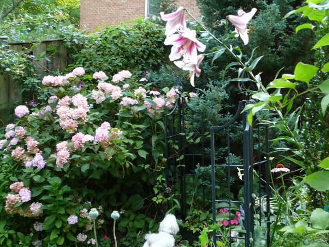 | Deanne – re the lily stem distortion – I think you’ve got a "fasciated lily". Google that phrase or see this link: http://www.wrls.org/culture/fasciation.html it’s temporary and will revert the following season (usually) – I had it last year & can attest that the same lily bulb is blooming normally & has the usual thickness of stem this year. . . . . interesting deviation – they sure look weird don’t they? Re the hydrangea behind the lilies (Samur, I think) )at least INSIDE my fence most of my lilies were safe (except from overwaterin) – that is H. serrata Preziosa... I’ve had it about 7 years – it just gets better and better – it’s the one that eventually turns dark red as it ages, but it starts out mostly white w/ a pinkish tint. Here’s another pic of w/ the lilies & Etoile Violette still blooming thru it...