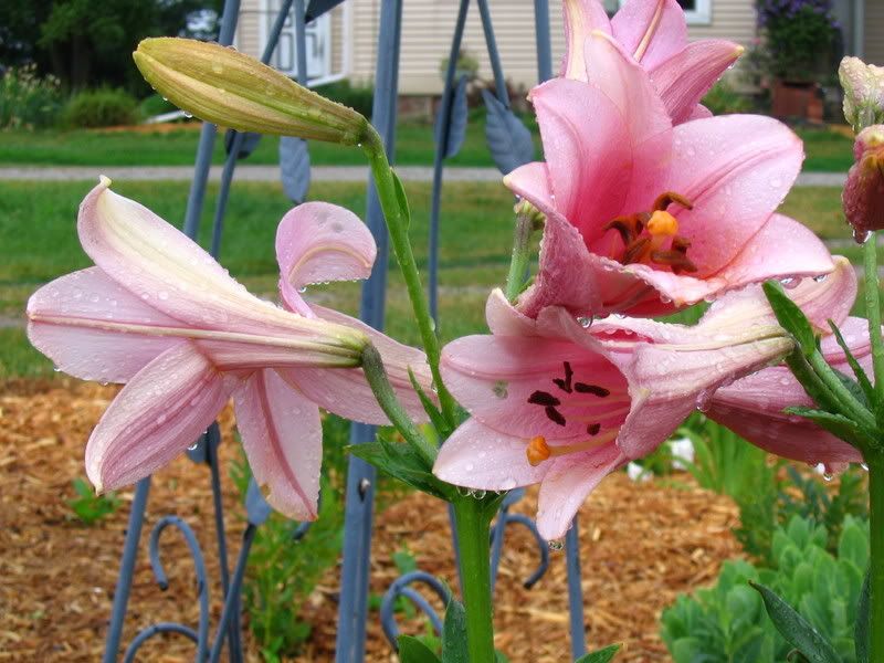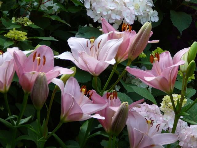 | Good morning all, We are having a cloudy start and are supposed to get some T storms in a bit. I need to go to the gym but think I’ll wait until after the storms pass so I’m not halfway through my workout and the gym loses power. That happened a couple of times and I couldn’t complete my workout so I’ll just putter outside and go later. Doug’s party was a huge success! We had such a good time. This was one of the few times when almost everyone we invited showed up. The only down side was that some of the teen age boys decided to play Frisbee in the front yard and broke several of the plants in the containers. What really ticked me off is that they didn’t tell me and I had to discover the damage for myself yesterday when I watered. They were well aware of the damage they’d done because on one of the plants, half the broken branches had been removed and disposed of. I didn’t find them so I’m assuming they went in the trash with the rest of the party debris. Wish I’d have gotten them as it’s a coleus I’m quite fond of and I’d have rooted the cuttings. Oh well, I’m still on the fence as to whether or not to speak to the boys involved and tell them what I think of their tactics. Breaking one plant is an accident, breaking five of them is just plain disrespectful. I must be old fashioned but kids should ‘fess up’ and apologize. Anyway, other than that the day was a huge success, Monique, Les, Sue and Tom joined us to celebrate Doug’s birthday along with lots of other friends and family. The best thing was Doug was like a little kid at Christmas and kept saying "This is such a great party! I’m so glad we did this!". So another decade begins for my beloved. I hope it is as auspicious as the perfect summer day we enjoyed for the party. It was a lovely 83 degree day with a bit of a breeze, no bugs, no rain. I couldn’t have ordered better weather. RE pics so sorry but I never got my camera out! I was too busy dealing with food and company, sorry! The gardens are just bursting with color right now and I so wish you all could come for a visit. I just love it when the daylilies get going along with the Asiatic Lilies. Cynthia, thanks for the heads up about the Bayer systemic. I’d heard about that and will definitely give it a try for next year. I’m sick to death of the horrible pests. They really do ruin things. Like Chelone I’m dealing with the second wave of them after not seeing any for a couple weeks. I’ve got to do something or the Orientals will be ruined. ~~ Sorry about Katie. I sure hope she is well soon. Chelone, it sounds like Rex is doing great and will recover perfectly. ~~ I agree with you that these beetles are just horrible. Those larvae with the black gunk (which I understand to be their waste products) are just disgusting. Bug, welcome home! I know you’ll have your gardens ship-shape in no time. ~~ I just love the photograph of you and Reed. Beautiful! Eden so glad to hear you had a great B Day and topped it off with ice cream. Let us know how you get on with the tree removal. I’m crossing my fingers that there is less damage than there appears to be. Mary, for some reason I can’t run that link, it keeps crashing my explorer so I’ll have to try again later. How wonderful though that you found that. I know what you mean about a piece of music that you remembered from your childhood. I saw ‘Darby O’Gill and the Little People’ when I was seven years old and there was a lovely little song in that movie that I can still sing. Actually I think Sean Conery sang it in the movie. It is so strange that I can remember a song that I heard once at such a young age. ~~ Happy Birthday to your DH! Lots of July birthdays, DD’s is today. ~~ Doug is out in Rochester this week. Shall I have him give you a call? Cindy, what hydrangea is behind those lovely lilies? It looks like that new ‘Blushing Bride’. Kathy, welcome home from vacation. Glad you had a great time. Michelle, bummer about the heat, LOL about going in the sprinkler. I’ve been known to do that a time or two myself. Martie, yep, goldfish just keep on growing! LOL. My ‘Big Bertha’ fish is now about a foot long which is a good sized goldfish. ~~ So glad to hear your daylily is doing well. I hope to see a photo of it in your garden. ~~ RE bicycling, I never bring my camera when bicycling. I’m too busy keeping my average speeds up to stop, LOL. V, the pond looks terrific! Love it. I would guess that dragonflies do eat baby leaches and any other larvae they can get. RE fish, they eat mosquito larvae and their waste products break down into nitrites, then nitrates which feed the pond plants. We have a bio filter on our pump which keeps the pond water sparkling clean even with seven large fish in such a small pond. Drema, great to hear from you. I so know what you mean about not having as much energy as you used to. Even though I’m fitter than I’ve ever been in my life I don’t have the stamina I did in my 20’s. I’m looking forward to seeing pics of your containers and lilies. You should see my ‘Regale’ trumpet lilies this year. They are about seven feet tall with lots of enormous buds this year. I’ll have to get some pics for you. I remember that you really loved them when you visited. RE lilies, has anyone ever had Orientals throw stems that appear flattened and then sprout three plus dozen flower buds? It almost looks like two or three stems morphed into one. I’m wondering if they’ve caught some kind of disease. I can’t imagine that all those buds are going to open. It should be interesting. Well I’ve finally gotten the hang of putting together a batch of ‘hot’ compost. The first large bin we did last weekend is cooking beautifully. (I had to give Sue and Monique the compost tour of the gardens, LOL) Yesterday Doug and I emptied the second huge bin of shredded leaves and mixed it up with grass clippings, watered it well and put it back in the bi
