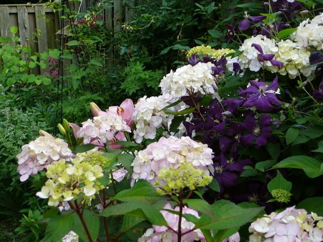 | Good afternoon GB - glad to see your clems are blooming despite being left to fend for themselves. Did you loose any? Baby Reed made me smile - what perfect little features. Ei - I'll have to go smell my quercifolia as I've never noticed any fragrance. I cannot remember now which cultivar it is. Michelle - hope your case Shingles is not too severe. It can be a rotten experience - take care of yourself. Chelone - glad Rex is doing well and being such a good patient. Cynthia - any updates on Katie? Last night really lived up to Michelle's title for this Idyll - a hot summer's night. Never the less it turned out to be a great evening with the Chicklits (our book group). We had a wonderful selection of food, lots of wine and good book talk. David came and played his guitar to us while we ate - he played so beautifully it almost brought tears to my eyes. A friend of my sister's from New Orleans has just moved to our town and I was able to introduce her to the group. It turns out she moved in 3 doors down from another book club member and both have sons the same age. I love it when you are able to introduce people and feel they will enjoy getting to know each other. Only one of the group was up for a swim and we floated in the pool under the stars with fire-flies flashing till late in the evening. It felt sooooooooo good. Another friend chatted poolside, entertaining us with stories of her wild youth. We've known each other for over 10 years and I would never have guessed at some of those secrets. We're all rather conventional now, happily engrossed in raising children, PTSA, jobs etc. but sometimes it's fun to remember earlier carefree days. Today I had a work lunch - it was social more than work, and I had the chance to see a training video I was filmed for earlier in the year. I was mostly pleased with the sections I was in, but thought I looked decidedly "wrinkly" especially on my forehead. Perhaps it's time to splash out on some Oil of Olay Regenerist. Tonight there are leftovers from last night (an easy supper), then David has Karate class. I think I should probably shoot for any early night too. Hi to all Mary |