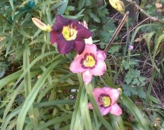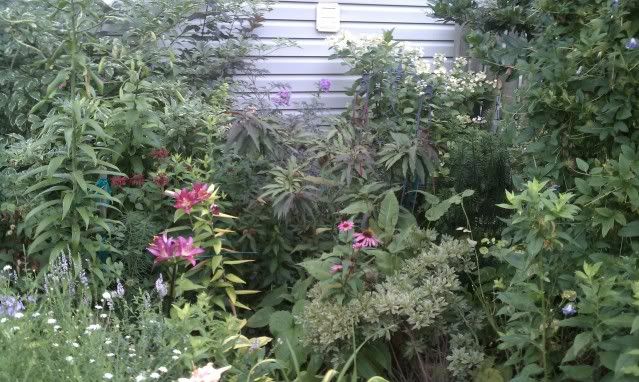 | My - it is too quiet here... looks like old idyll threads got spammed.... It's still the Washington HHH here... the last of my daylilies are working hard (I wish I had more late late bloomers -it's hard to think that here it is the beginning of July and they're almost gone over now - how can that be?).... The echinaceas and phlox are starting to kick in... here's a couple from out the door this morning I grabbed with the phone camera -- blowsy wild and chaotic, no matter how I try to tame and re-group, there's nothing immaculate about this place, LOL: