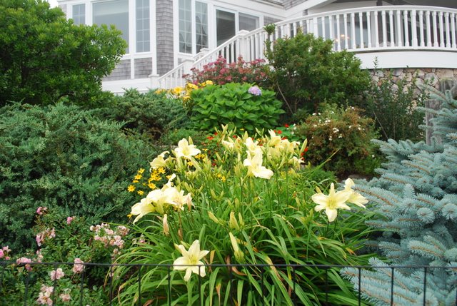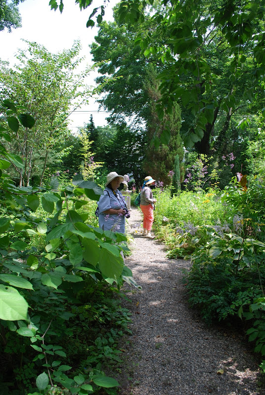 | Good morning..... I was just wondering if I was the only Idyll who hadn't met everyone? Deanne's garden is even more fabulous in person! As you would expect, everything was perfectly groomed and artistically staged. Luckily the rain held off and we all were able to tour the gardens to our heart's content. The lilies, clematis, cimicifuga and all her pots, were at their peak. Perfect timing! The driveway garden was a study in contrast, color and texture. Deanne has designed a wonderful garden space. She took advantage of the lay of the land, which slopes toward the house from the back lot line, and built her raised beds with rock herself, which I hadn't realized. That's a LOT of work! They have a wonderful family room facing the garden with wall to wall windows and the effect of the raised beds and the slope is that the garden is at eye level and has quite an impact through the windows. Both Deanne and Doug are gracious hosts who make it easy to feel comfortable in their home. I'm so happy we were able to go. I was camera-less, but fear not, Marlene and Kathy have that covered. :-) So, I wait to hear more about the weekend. I think today and tomorrow are supposed to be better weather. I would love to be waking up in Maine and traveling to Boothbay today. It is a wonderful area on the ocean. Wondering how everyone else is doing?
