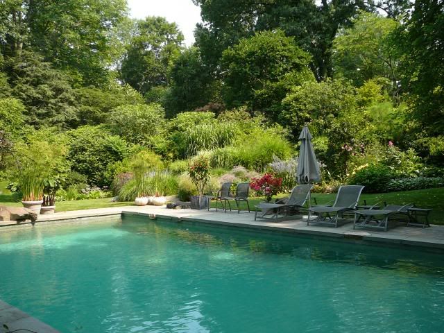 | The first garden of Open Days: As we came out of a shaded entrance, we were greeted by open views - of course the heat kept us headed toward the pool...anyone have a picture of my favorite pool?: Just past the pool - a path to terraces around the house: and views of the lake: back down to the sunny border: That led to the pergola overlooking a lotus pond:
