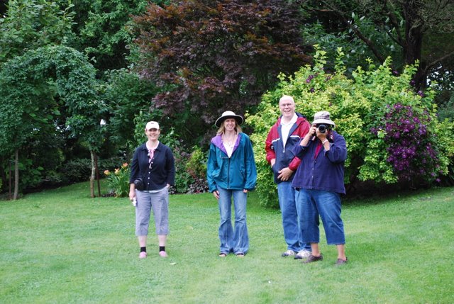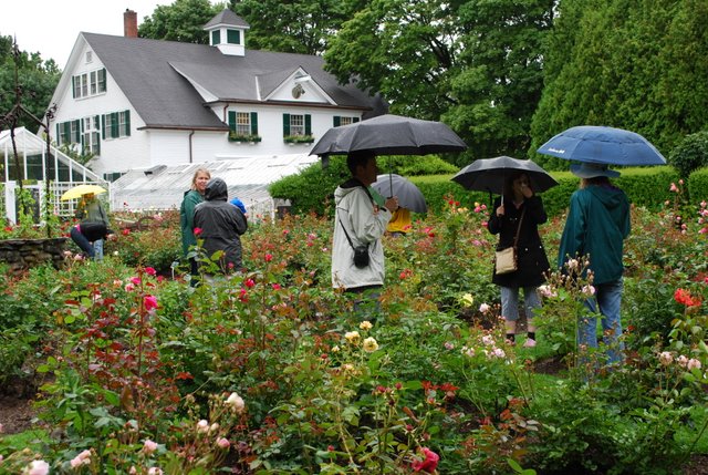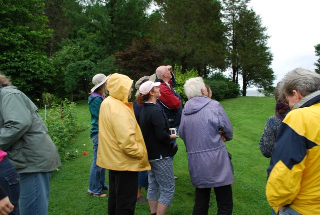 | Our hostess Cynthis Hosmer was just charming, and took the time to walk us about, explaining to us the family history behind her wonderful home and gardens. We were gratified to learn that she takes the stewardship of the land she lives on very seriously and has put it in trust for future generations to ensure that it remains the pristeen setting it is. What a setting ! Happy Idylls --yay it stopped raining ! Saucy ponders the espallier-perhaps there is one in Terrapin Stations future ?