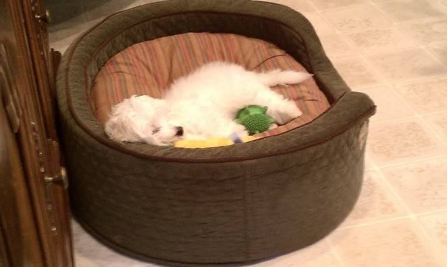 | Sorry for the late check in for folks who wanted to know about Stella -- she's kept me Quite busy.... we're both busy bees. She arrived safe but woeful yesterday - poor thing got car sick on her first long car trip... and has not been terribly interested in eating altho I've now managed to get one good meal in her. But she's pretty and sweet and frisky.... one forgets like babies how tiring puppies are, LOL; I'm sure that's for a good reason. Denise -- I hope Ein's surgery goes well and he bears the shame cone with stoicism and dignity (I know that's hard wearing one of those things)... Michelle - have a fantastic trip - what a glorious place to go -- it will certainly be cool there and the sights - o my. I hope Kathy has a great and not too cruel, gruelling road trips... and manages some gardens to relax in! I havent done a lick of gardening this weekend - Im afraid my next weekend visitors are going to have to wear blinders if they step outside - the sight is pretty icky! And there's lots of puppy chaos - how does it affect the whole house? I dont get it - except for having to remove the baskets and plants from puppy contemplation and nibbles, and gates galore to safeguard the fast flash thru hands that miss to areas of new fascination and exploration....I do crate her, but hate to do it for very long... We had a great nite last nite tho as she was soooo tired... Here are a couple pics: Stella - when she decided she needed some down time: