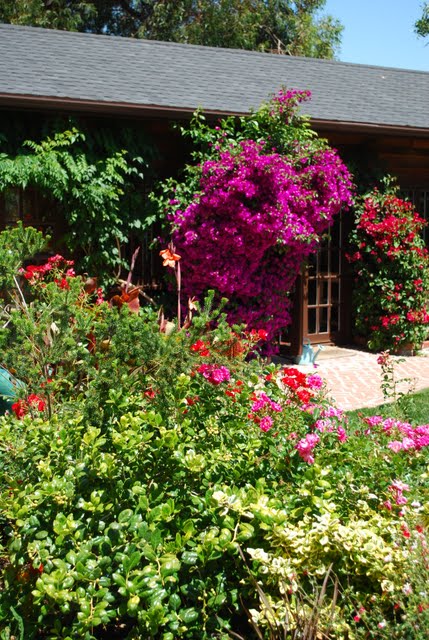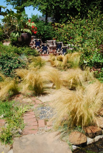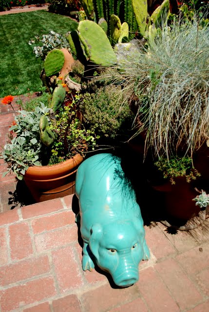 | So much fun to see private gardens with new ideas! Love the bricks and bicycle wheel, rust and bougainvillia, grasses and pig and pots and the blue sky... |