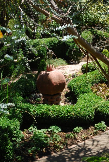 | I see that I need to take another trip to Napa, lol! I love this garden. I'm amazed at the brick "wall" along the stairs...however did they come up with that idea? Wow. I really like the pomegranate, but I wonder if it might be a Little and Lewis piece that I've seen in their catalog. (Nope, went and looked and I think there's was a private commission) Thanks for taking us along... Saucy |