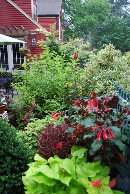 | Wow Sue! You're place is gorgeous and Kathy is a wonderful photographer too! I love all your pots and your color schemes Sue. Everything is just beautiful. I love the way you use the color red too...I have a hard time choosing just the right red, but you have it down pat! :-) Love, love, love the planting along the fence. Thanks again Kathy for sharing all your great shots! Eileen |
