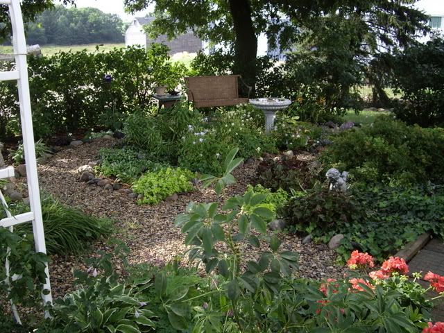 | Thanks Babs! Should I climb on the garden shed roof for a picture? LOL The foliage in picture #3 upper right is a red twig dogwood behind the pots. The rocks are all from our fields picked up over many years. The bench is one of my favorite spots, in fact I sat there for a couple of minutes just this a.m. before leaving for work. Thanks again for all the kind comments everyone. Michelle |