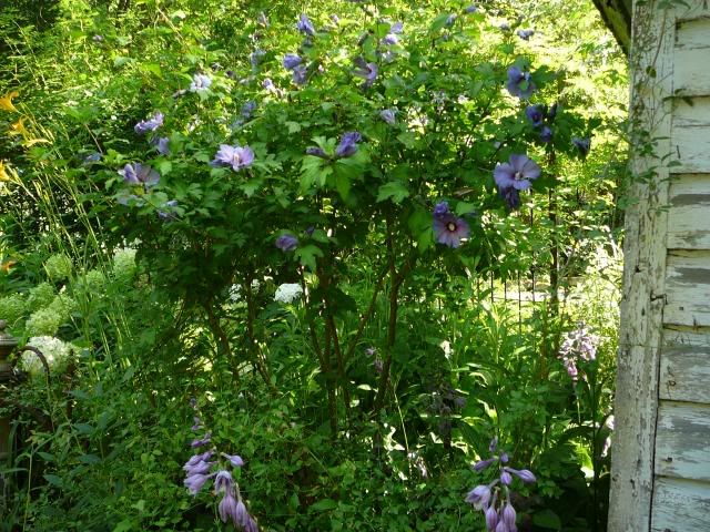 | I was going to say that Kathy's shots of her garden remind me of David's old one! The colors are reminiscent of that to me -- lovely combos -- Yes, Deanne - that b-day shot was Wave Hill - the bed you liked so much....and now I do recall you mentioned living at Chinco. as a small child -- I suspect that was quite different than "roughing" it in a little summer cottage for 2 weeks annually that I did for so long. It's become somewhat of a tourist spot now, but still retains the rustic charm - they've got a new bridge into town and everything! The fishing industry is pretty much dried up (like a lot of places these days). Chelone - yep, I am feeling a bit dried up, I suspect there are less kinder descriptions that we could make -- it just seems that the awfice is so intense and draining these days, I have little or no inclination to even look at a computer at nite or weekends -- terrible because these idylls can whip by!. Re the H. syriacus Blue Bird cultivar - I did some reading and grazing on the 'net (gw and other places) and it appears that Blue Bird is less hardy, more finicky and less floriferous than the newer Blue Satin - at least that seemed to be the verdict; hence, my decision to try the BS - I'll let you know how they over winter. I personally prefer them looking more standard/tree like and hope to keep them to that style - time will tell. The ones we've seen in real life also seem to be in somewhat shadier area and a bit sheltered -- so Im trying that route. I dont think they need full sun, unlike some of the other varieties -- the one we saw at Inta's house by the potting shed was actually quite shady it appeared - probably gets only part sun, but it's the older cultivar obviously. Remember this?