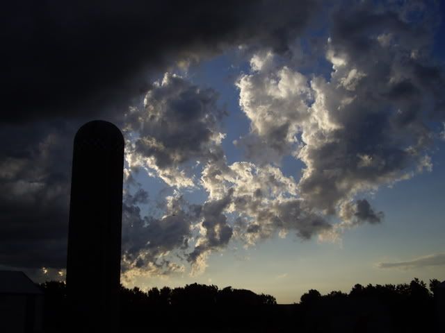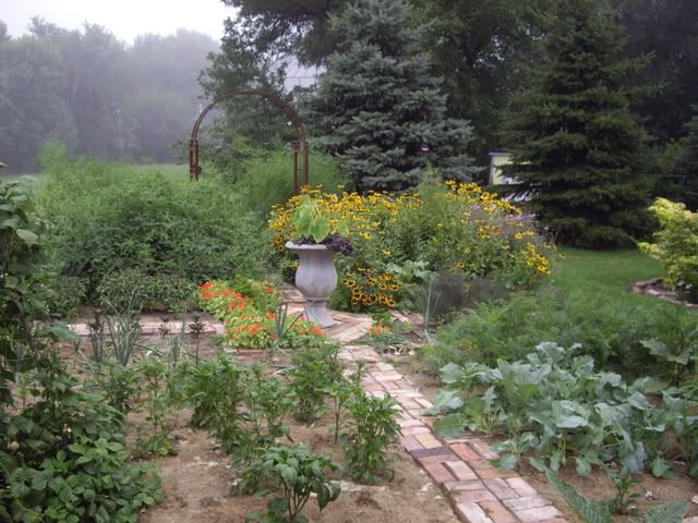 | Exquisite, Michelle, the gardens, the cowgirl, and those clouds behind the corn silo (?). The potager has really grown into the paths, and the new arbor is perfect. |
