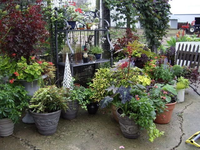 | Good morning all, Condolences to V. ~~ RE cousin, Family dynamics are a mystery. So the family was afraid he'd get killed in the Army so they didn't speak to him the rest of his life? Unreal. ~~ So happy the pig roast was a huge success. Hmmmm... maybe I'll have to time my visit to you with the pig roast some year. LOL Thanks Michelle for that information on the euoymus. I kind of thought it looked like that. I'm thinking of training a cutting of my Coprosma kirkii into a standard. It grows very fast also and would be a great specimen if I could pull it off. ~~ Interesting you found a pic of Inta's potting shed in a gardening book. Denise I absolutely love that fire pit used as a water feature! You clever woman you. I'm getting worried about Eden. I hope all is well with her Mom. Mary, when DD was a bit younger than Annie her room would have been condemned by the board of health. One time she'd left the windows open and we got a summer thunder storm. When I went in there to close the windows I COULD NOT REACH THE WINDOWS for the accumulated detritus on her floor. I fell down tripping on something and needless to say was quite unhappy with the situation. Privacy is one thing but a fire hazard is another. I wound up starting the clean up with a snow shovel and oversized garbage bags. She got the message and finished cleaning her room. Marian, great news about Nolan. Well we are in for another beautiful day here. This morning it's 49 degrees outside and I'm afraid we are going to be in for an early frost this year. The mornings have been downright chilly for the last week or so. I'm getting anxiety attacks over how I'm going to get all this plant material in for the winter. Cynthia, love the pic of the puppies! You realize you are engaging in PLAT behavior by cleaning out everything except what really needs to be done? (Perfectly Legitimate Avoidance Technique) I've been known to scrub toilets instead of painting. LOL Here is a photograph of my 'on sale' cement pot I bought myself for my birthday. For some reason I had a hard time getting a decent photo of it. I just love the grapes on the handles and the leaves on the rim.