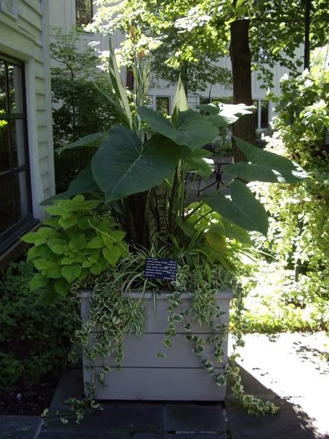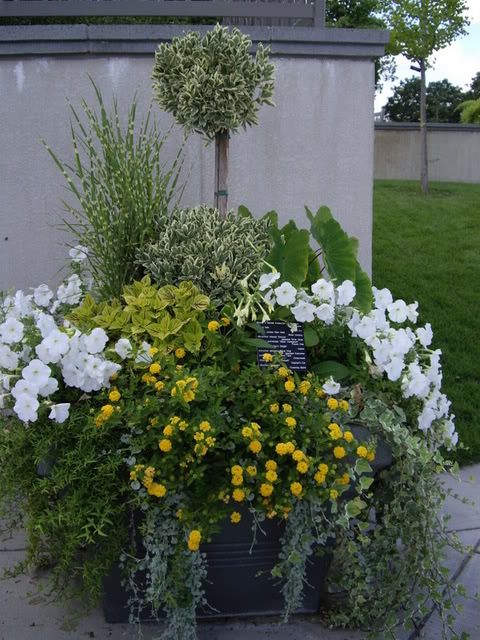 | I'm in for a quick break. Most of the containers have been returned to their proper place. The lawn is 1/2 mowed, but should really be raked as the grass was so terrible long, but I doubt it will get done. Some people get a t-shirt or sweatshirt as a souvenir of their vacation. I came home with 2 pots, 6 perennials and a bunch of bulbs. At the beginning of the trip we spent a night with Rick's son and DIL. She's a nurse and worked all night so she slept the next morning. Rick wanted to help his son make some shelves in the garage. He asked if I minded spending some time by my self at the Arboretum. Odd question I think. The theme of their annual plantings this year was yellow, white and silver. Here are a couple of containers that caught my eye.