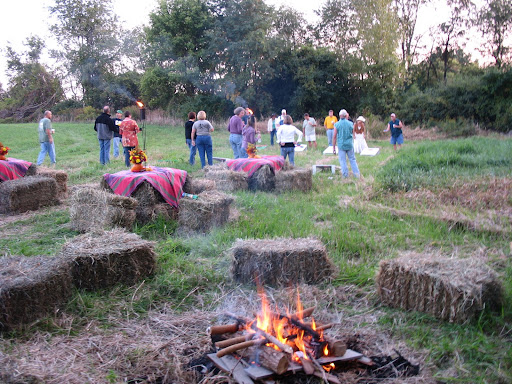 | Reminds me of Lynn's daughter's outdoor wedding V...Lots of hay bales, flowers and fun. Yesterday we bought pumpkins, including a baby one. (We were advised to start traditions around this awful business.) They are sweet and add color to the place. Deanne thanks for the supportive net...kind of like a hammock! Just being there and allowing me to prattle on seems to be what I need- today at least. Even those simple repetitive chores like raking and mowing seem to sap energy from me these days, but at least I am moving along. Forums are easier than curious people descending and expecting tea and conversation. Phoebe is eating her regular food again...but doesn't want me to watch her! She enjoys running wild while we work outdoors and has been a great companion for us. What a goof! Of course Woody's cookies are still a great reward for any good behavior. ;) She really was a good girl watching from the porch as I mowed. Julie, you have way too much energy!!!! Glad DD gave you a day's rest from your young Phil in training. You guys are going to be so sick of me... |